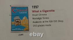Très Rare Briquet Zippo Vintage Camel Double Face, Quel Cigarette, vers 1998, Édition Limitée, Seulement 250 Exemplaires Fabriqués. Ce Briquet Zippo Camel en Chrome Satiné faisait partie de la Série Nostalgique et représente une Publicité Camel de 1915. Le zippo est en bon état de fonctionnement inutilisé mais avec quelques petites pertes sur le décalque arrière - comme indiqué dans l'une des images. Vient dans la boîte zippo avec la garantie à vie zippo et la housse Zippo Camel.